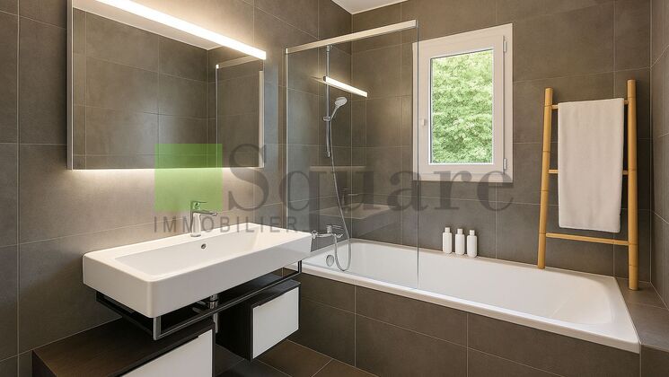 Dès l’entrée, un espace fonctionnel avec rangements et buanderie (machine à laver et sèche-linge) apporte confort et praticité. Un couloir mène à une première salle de bain avec douche, lavabo et WC.